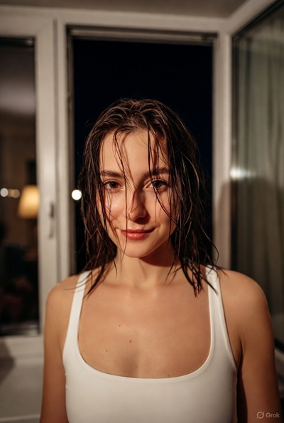 สุดท้ายเธอปิดน้ำ ยืนให้ลมแอร์เป่าให้แห้งสักพัก ตัวขาว ๆ ขึ้นลายกับไฟส้ม หยดน้ำสุดท้ายติ๋งจากหัวนมลงพื้น แล้วเดินไปหยิบผ้าขนหนูเช็ดตัวแบบไม่รีบ… ก่อนจะเดินออกจากเฟรมไป